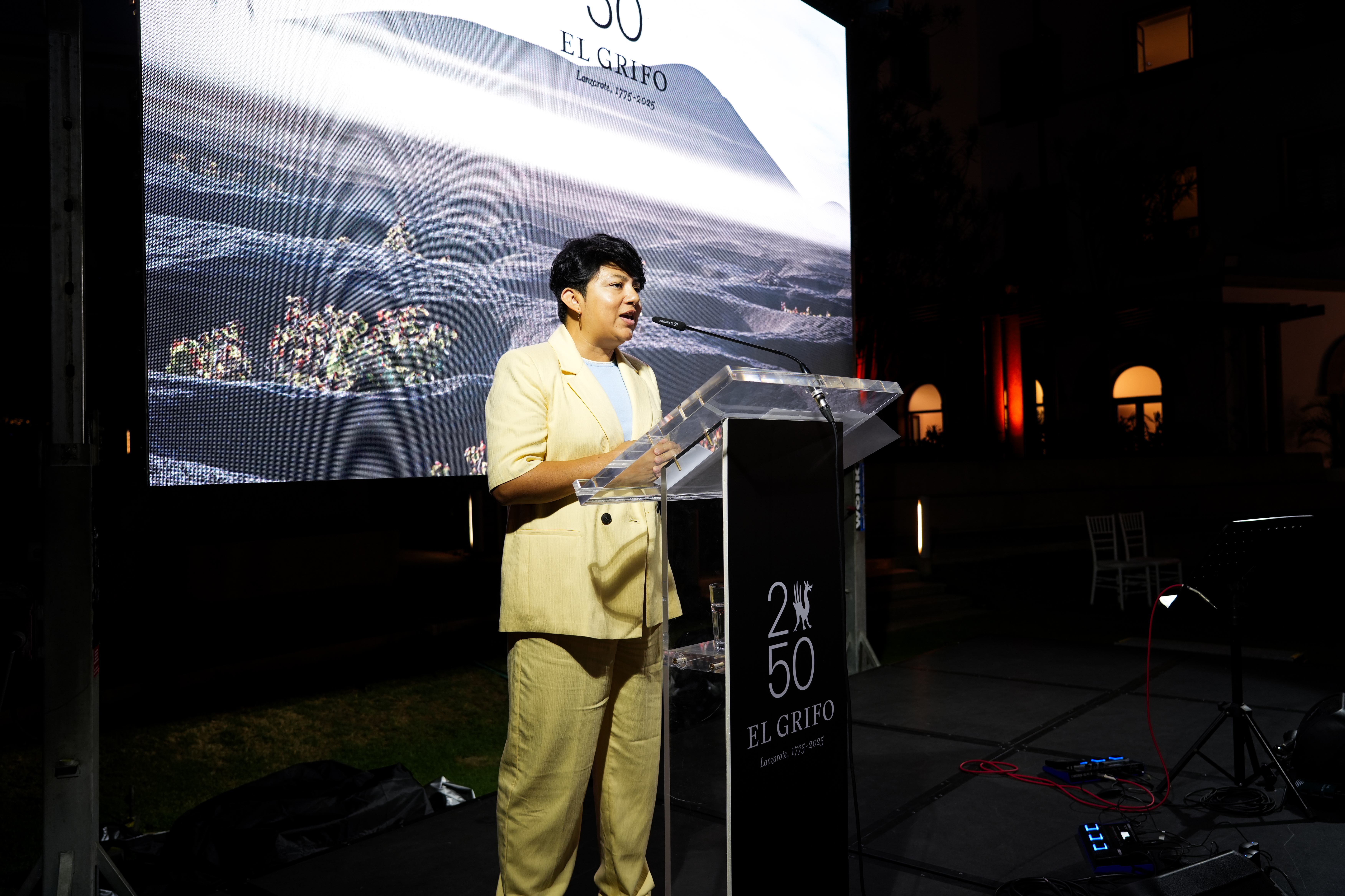 Uno de los momentos más destacados de la noche fue la presentación, a cargo de la enóloga de la bodega Dª Elisa Ludeña, de la edición especial del vino Malvasía Volcánica sobre Lías 250 aniversario de la añada 2018, con 28 meses de crianza sobre lías y 4 años de reposo en botella, elaborado como homenaje a la tradición y al espíritu innovador de El Grifo.